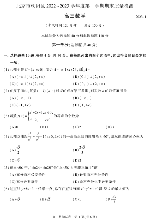 高三数学+答案--北京朝阳区2023年高三上学期期末