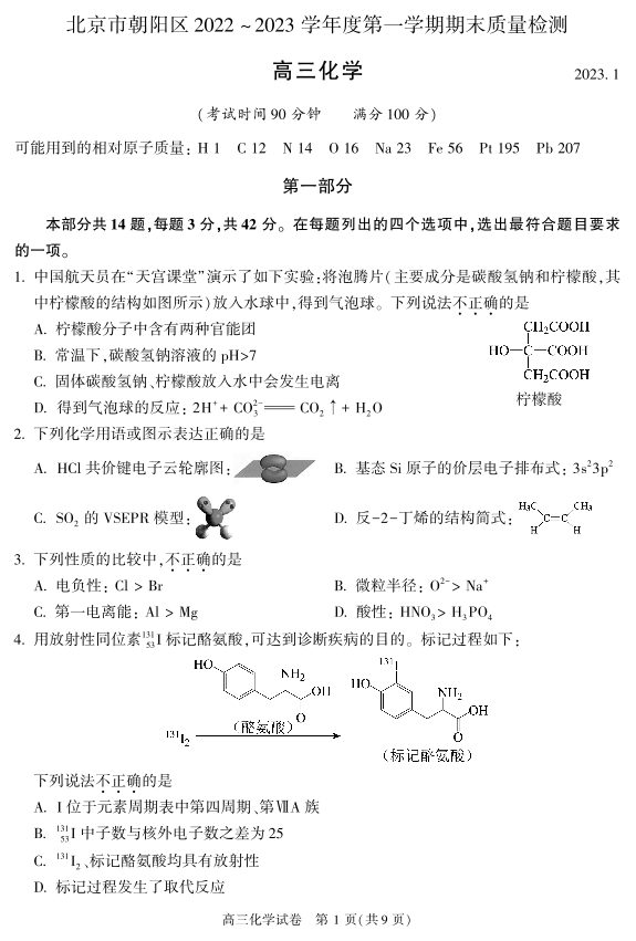 高三化学--北京朝阳区2023年高三上学期期末