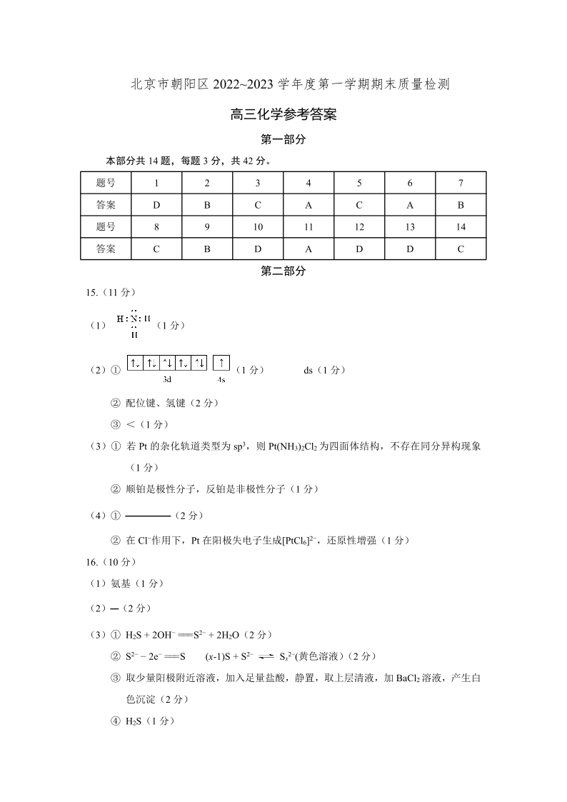 高三化学答案--北京朝阳区2023年高三上学期期末