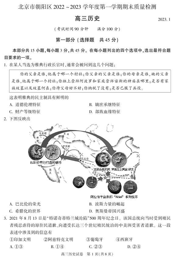 高三历史+答案--北京朝阳区2023年高三上学期期末