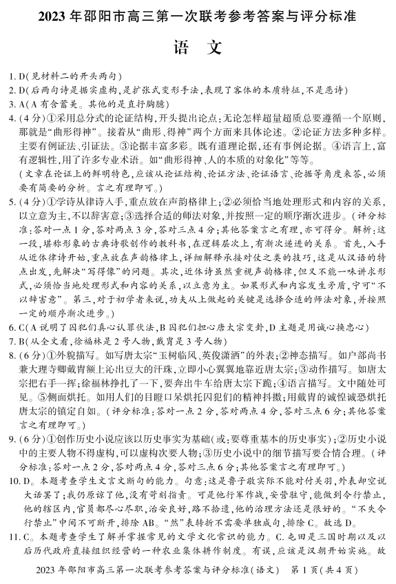 高三语文答案--湖南省邵阳市2023届高三第一次联考(邵阳一模)