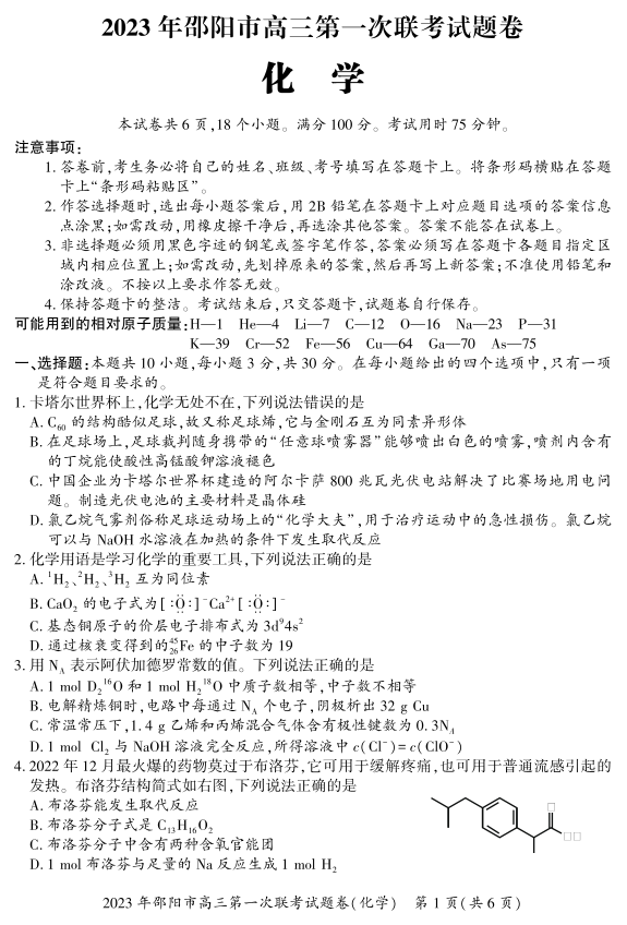 高三化学+答案--湖南省邵阳市2023届高三第一次联考(邵阳一模)