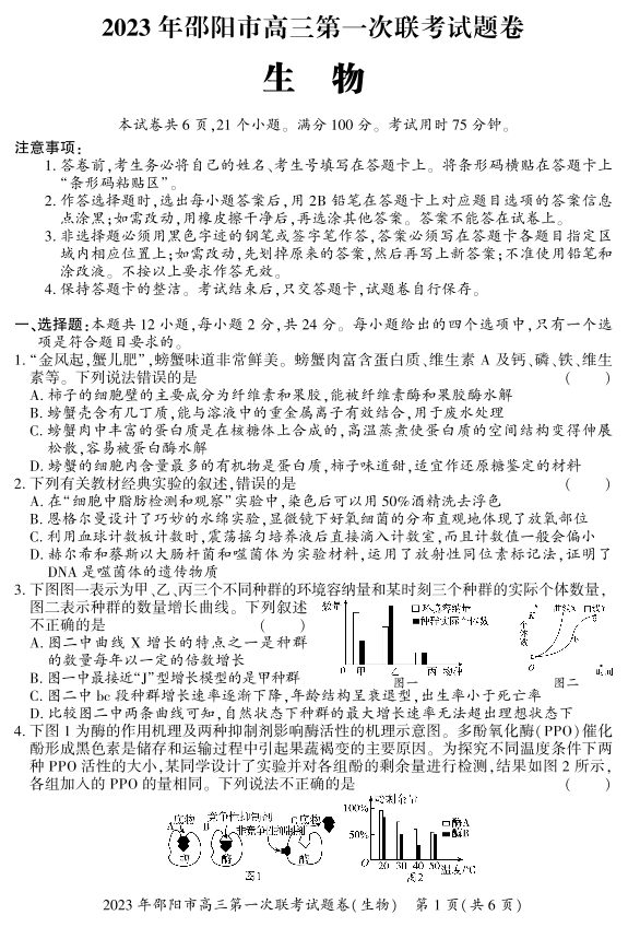 高三生物+答案--湖南省邵阳市2023届高三第一次联考(邵阳一模)