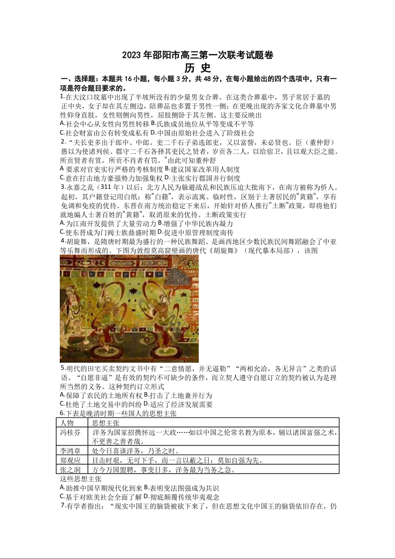 高三历史+答案--湖南省邵阳市2023届高三第一次联考(邵阳一模)