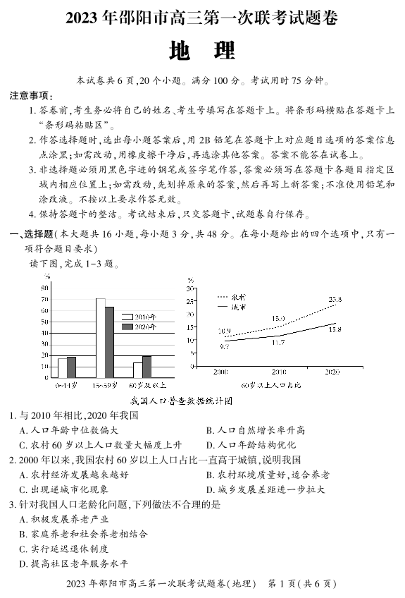 高三地理--湖南省邵阳市2023届高三第一次联考(邵阳一模)