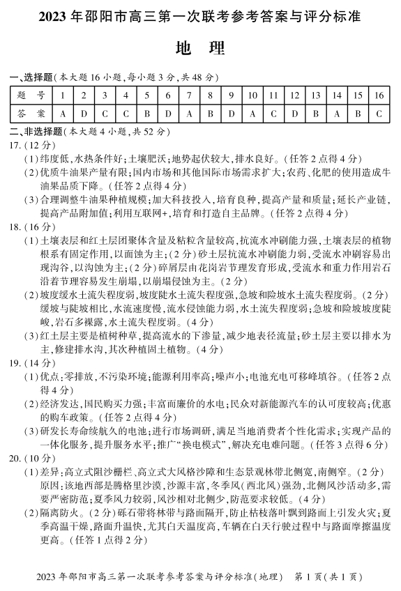 高三地理答案--湖南省邵阳市2023届高三第一次联考(邵阳一模)