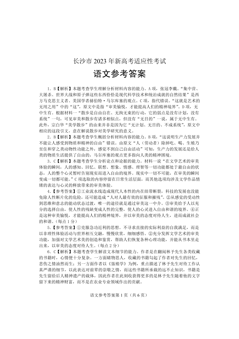 高三语文答案--湖南省长沙市2023年新高考适应性考试