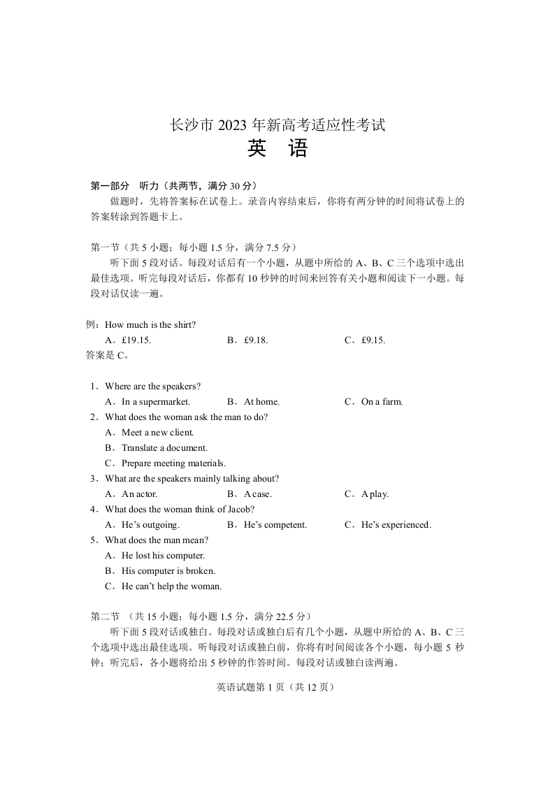 高三英语--湖南省长沙市2023年新高考适应性考试