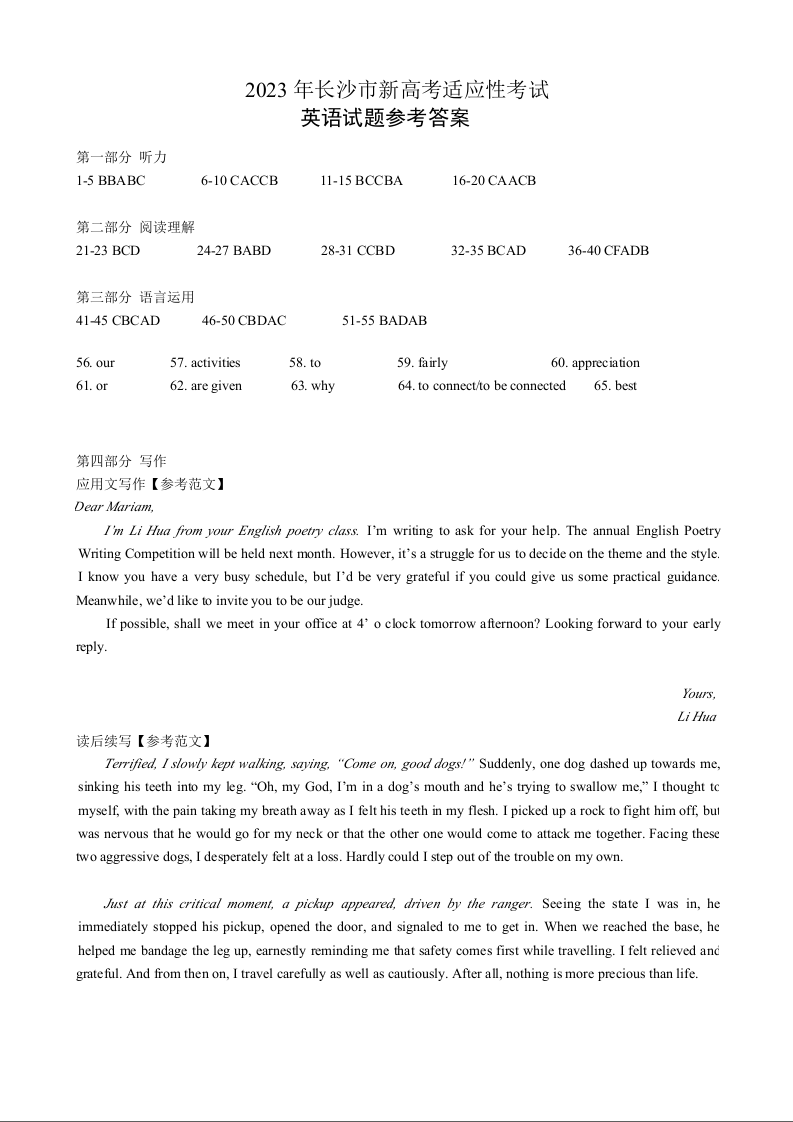 高三英语答案--湖南省长沙市2023年新高考适应性考试