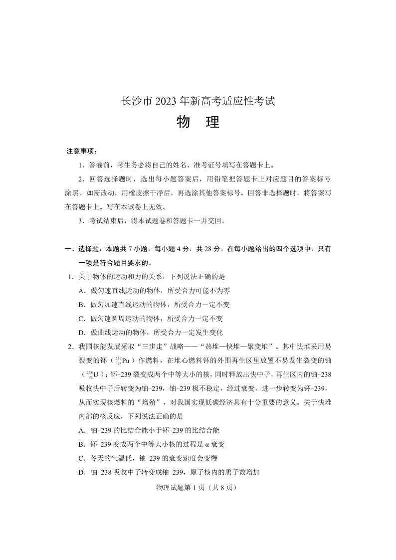 高三物理--湖南省长沙市2023年新高考适应性考试