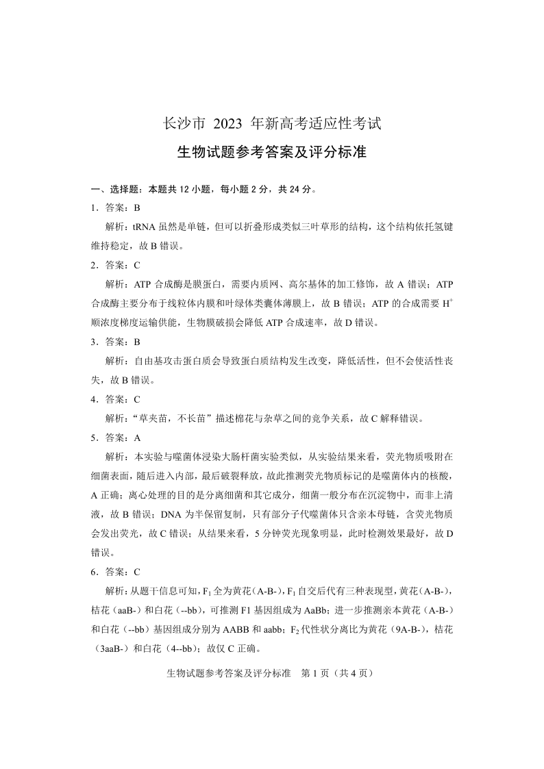 高三生物答案--湖南省长沙市2023年新高考适应性考试