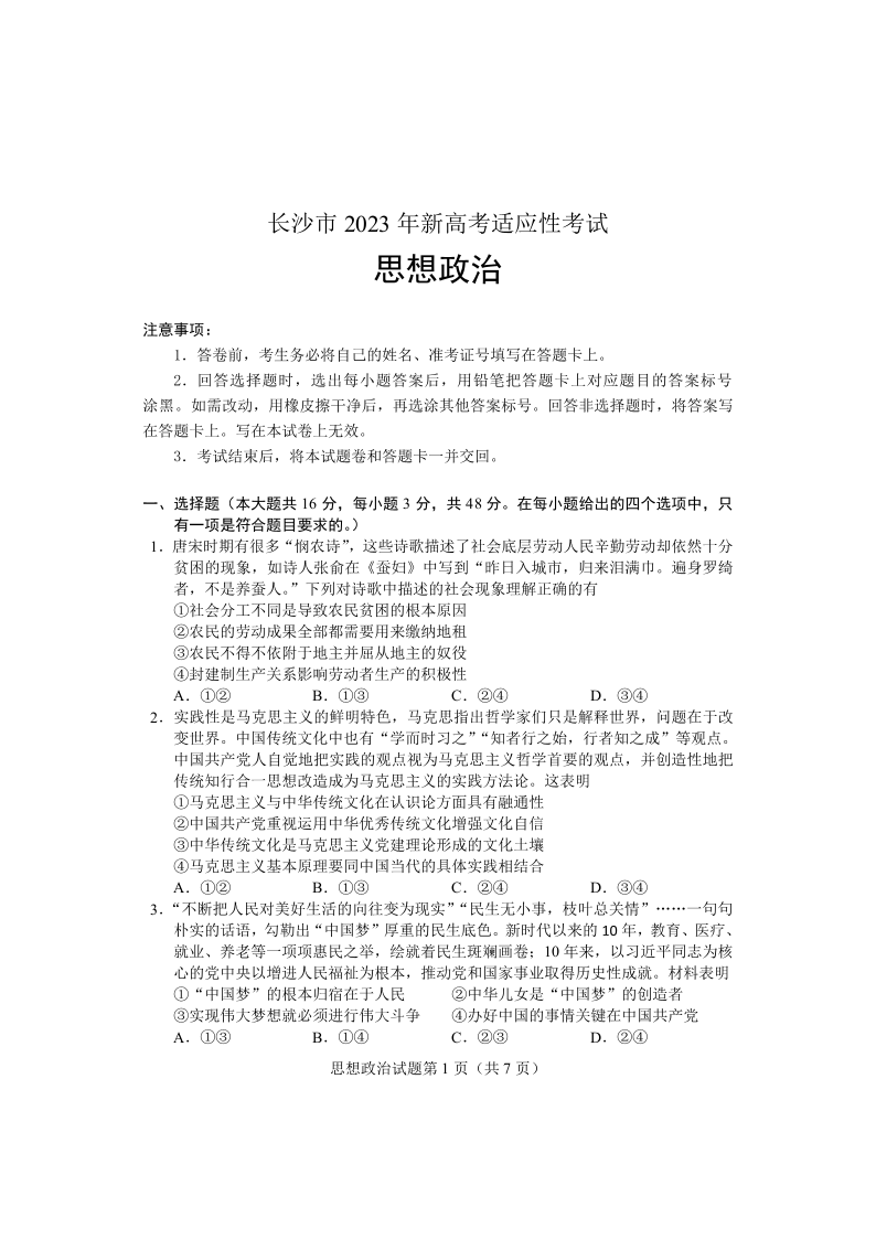高三政治--湖南省长沙市2023年新高考适应性考试