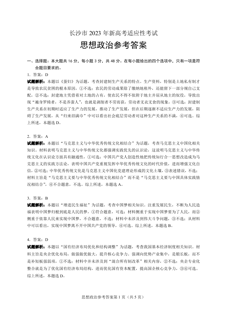 高三政治答案--湖南省长沙市2023年新高考适应性考试