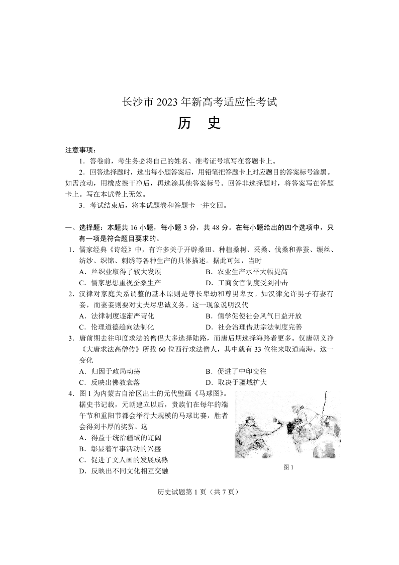 高三历史--湖南省长沙市2023年新高考适应性考试