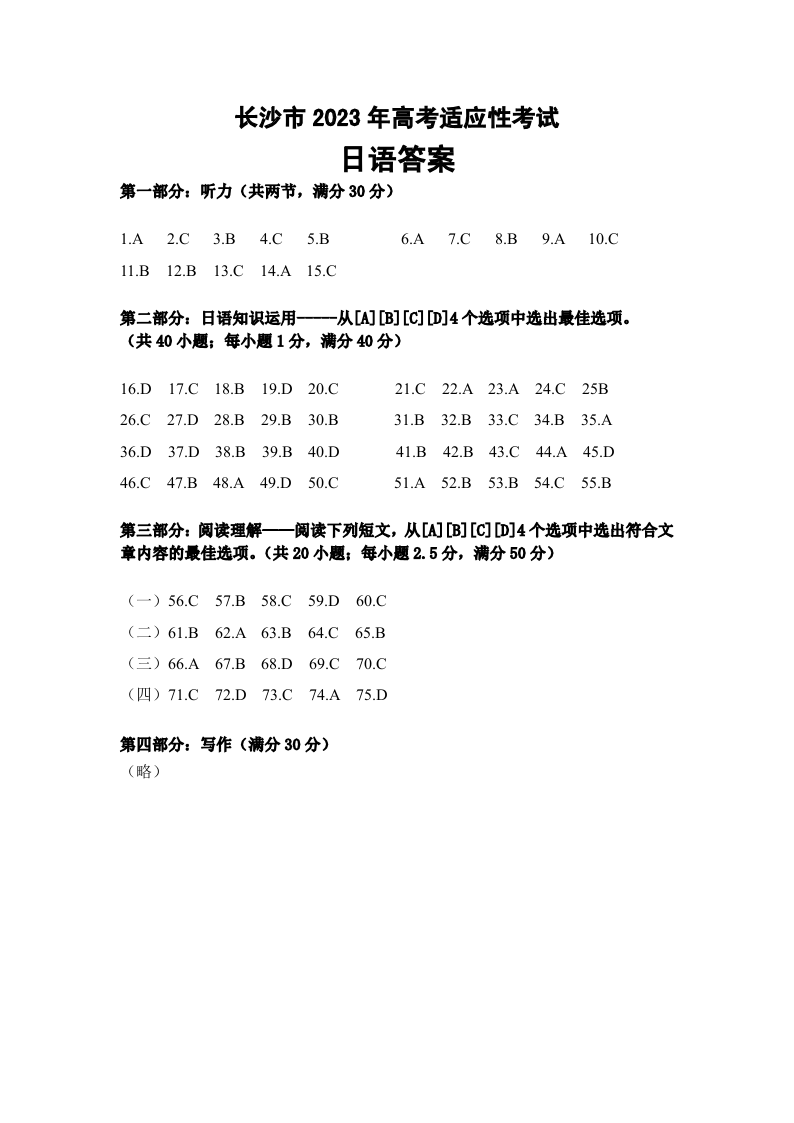 高三日语答案--湖南省长沙市2023年新高考适应性考试