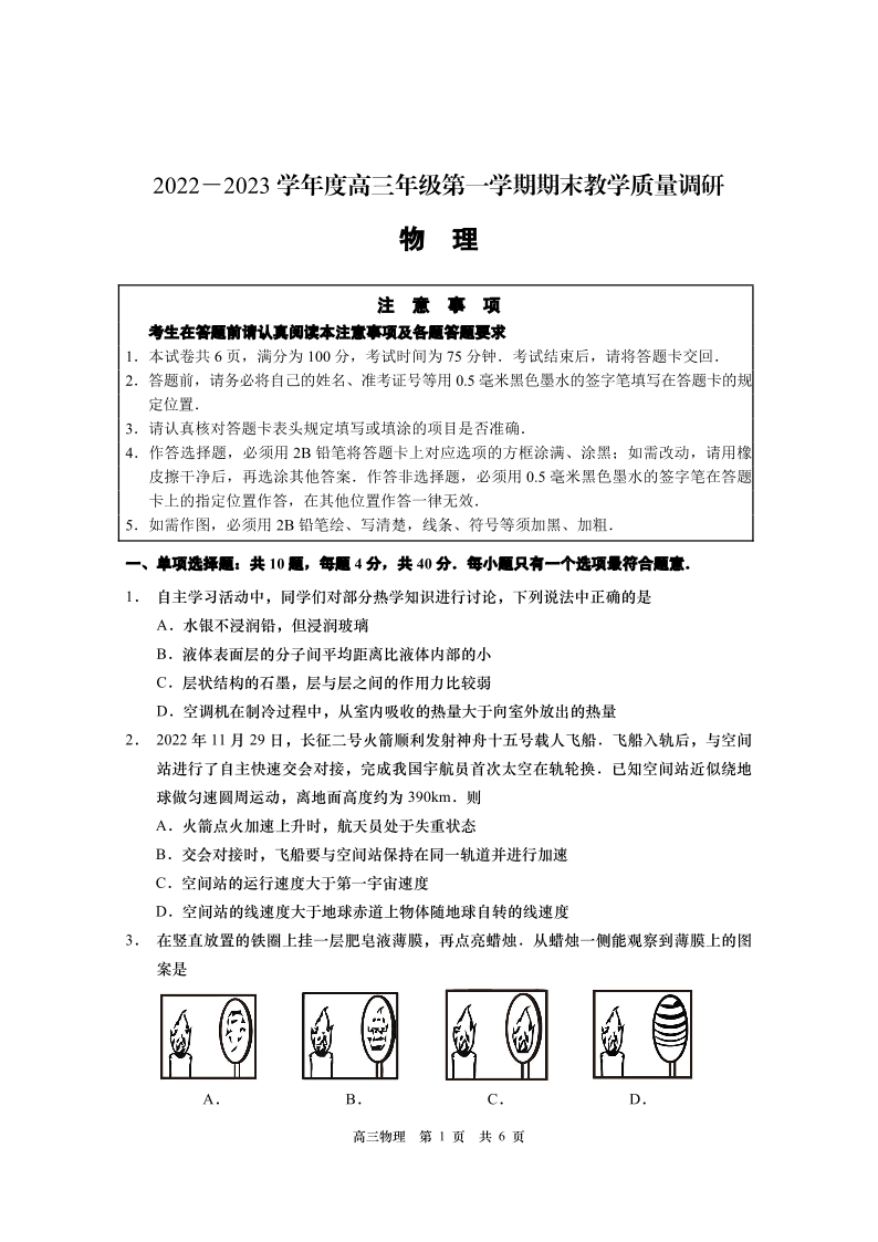 高三物理+答案--江苏省南通市如皋市2022-2023学年高三上学期1月期末