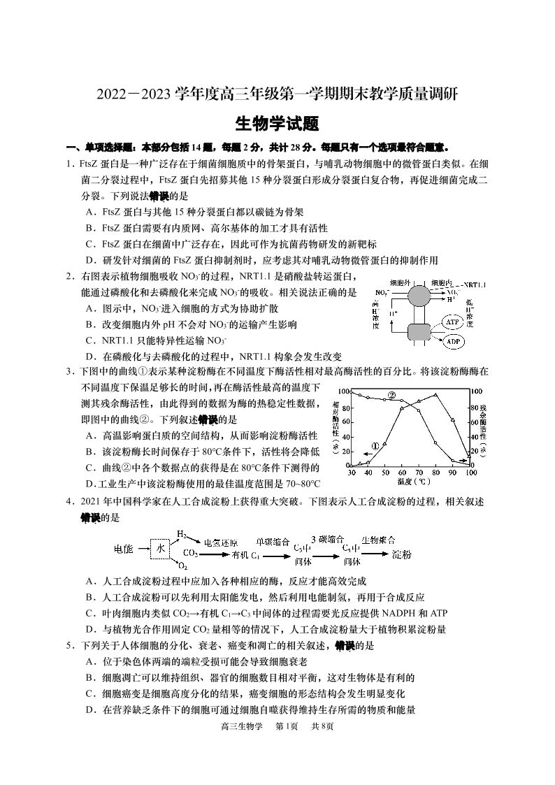 高三生物+答案--江苏省南通市如皋市2022-2023学年高三上学期1月期末
