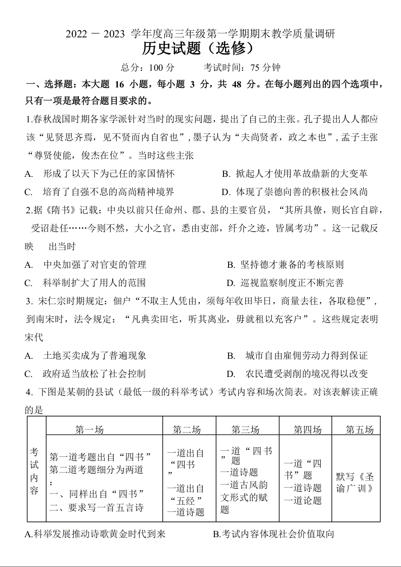高三历史--湖南省长沙市2023年新高考适应性考试