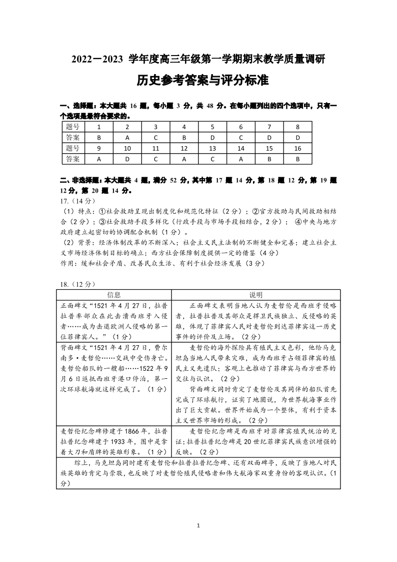 高三历史答案--湖南省长沙市2023年新高考适应性考试