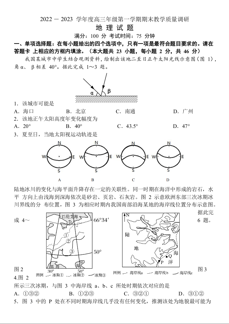 高三地理+答案--江苏省南通市如皋市2022-2023学年高三上学期1月期末