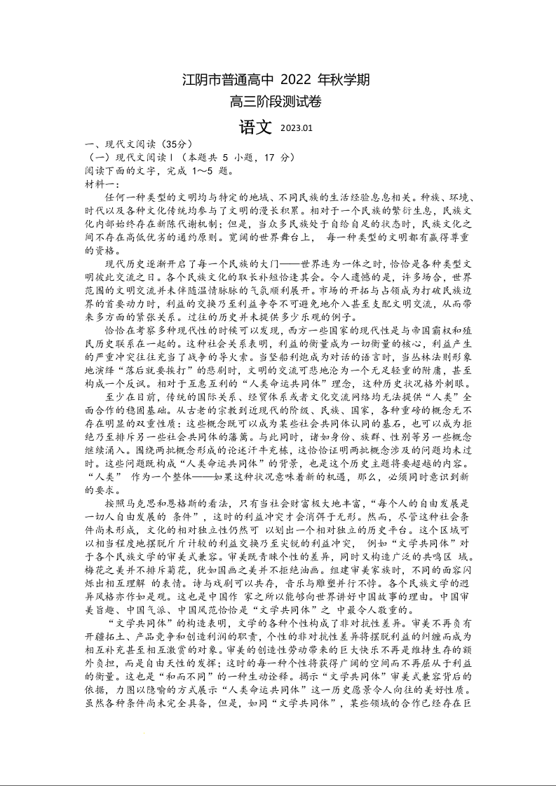 高三语文--江苏省无锡市江阴市普通高中2022-2023学年高三上学期阶段测试(期末)
