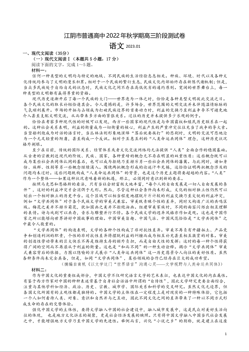 高三语文答案--江苏省无锡市江阴市普通高中2022-2023学年高三上学期阶段测试(期末)