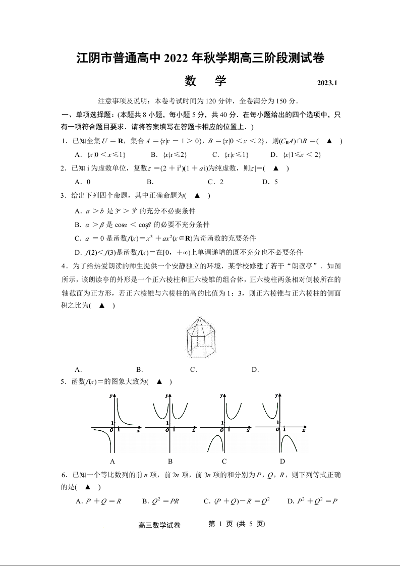 高三数学(原卷版)--江苏省无锡市江阴市普通高中2022-2023学年高三上学期阶段测试(期末)