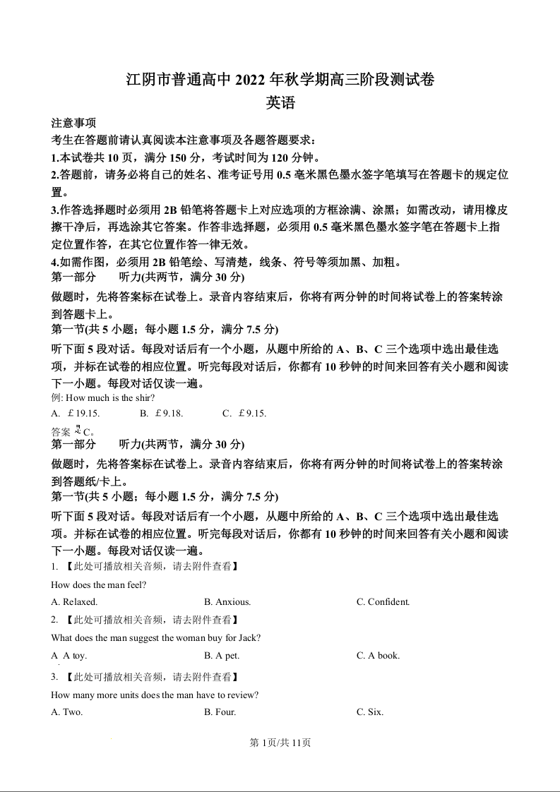 高三英语(原卷版)--江苏省无锡市江阴市普通高中2022-2023学年高三上学期阶段测试(期末)