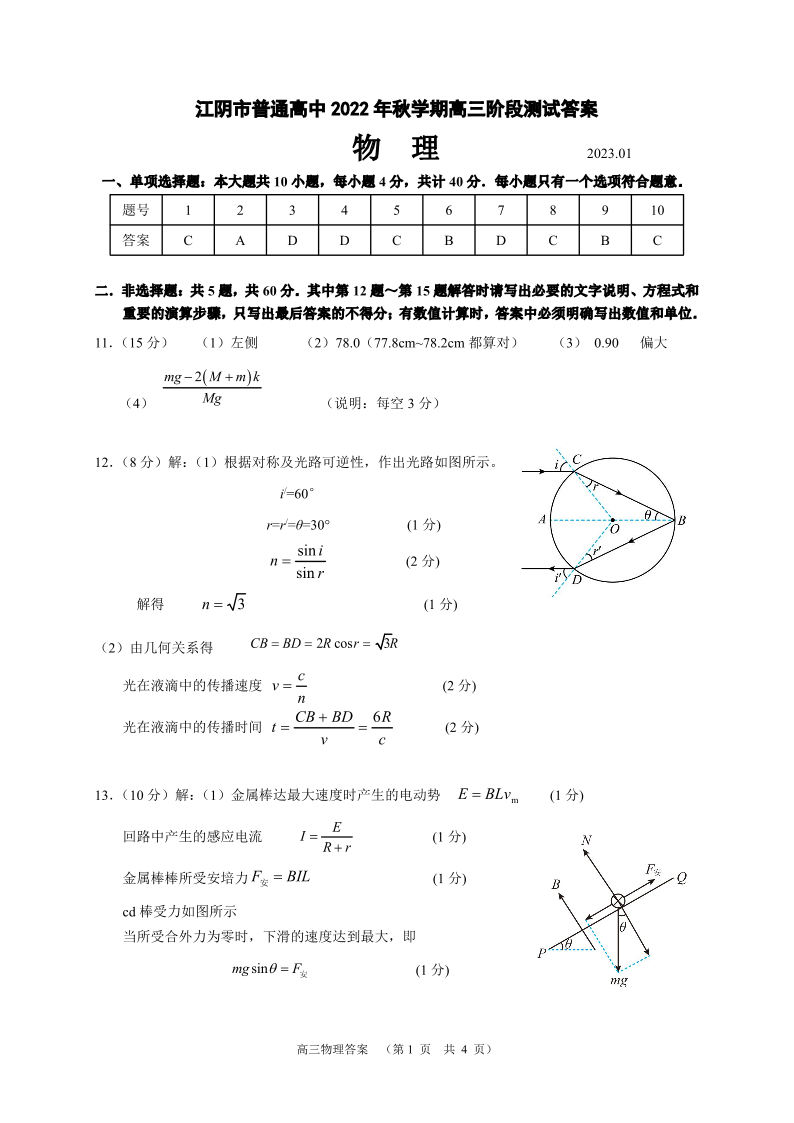 高三物理答案--江苏省无锡市江阴市普通高中2022-2023学年高三上学期阶段测试(期末)