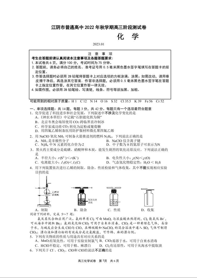 高三化学+答案--江苏省无锡市江阴市普通高中2022-2023学年高三上学期阶段测试(期末)
