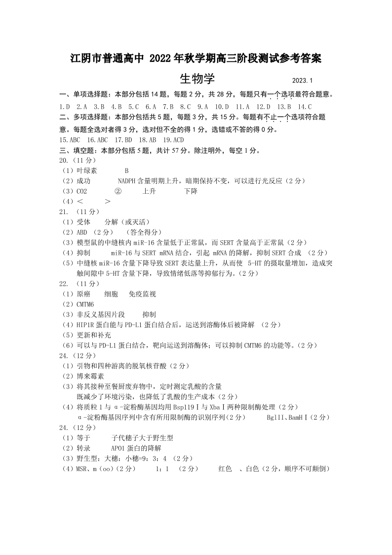 高三生物答案--江苏省无锡市江阴市普通高中2022-2023学年高三上学期阶段测试(期末)