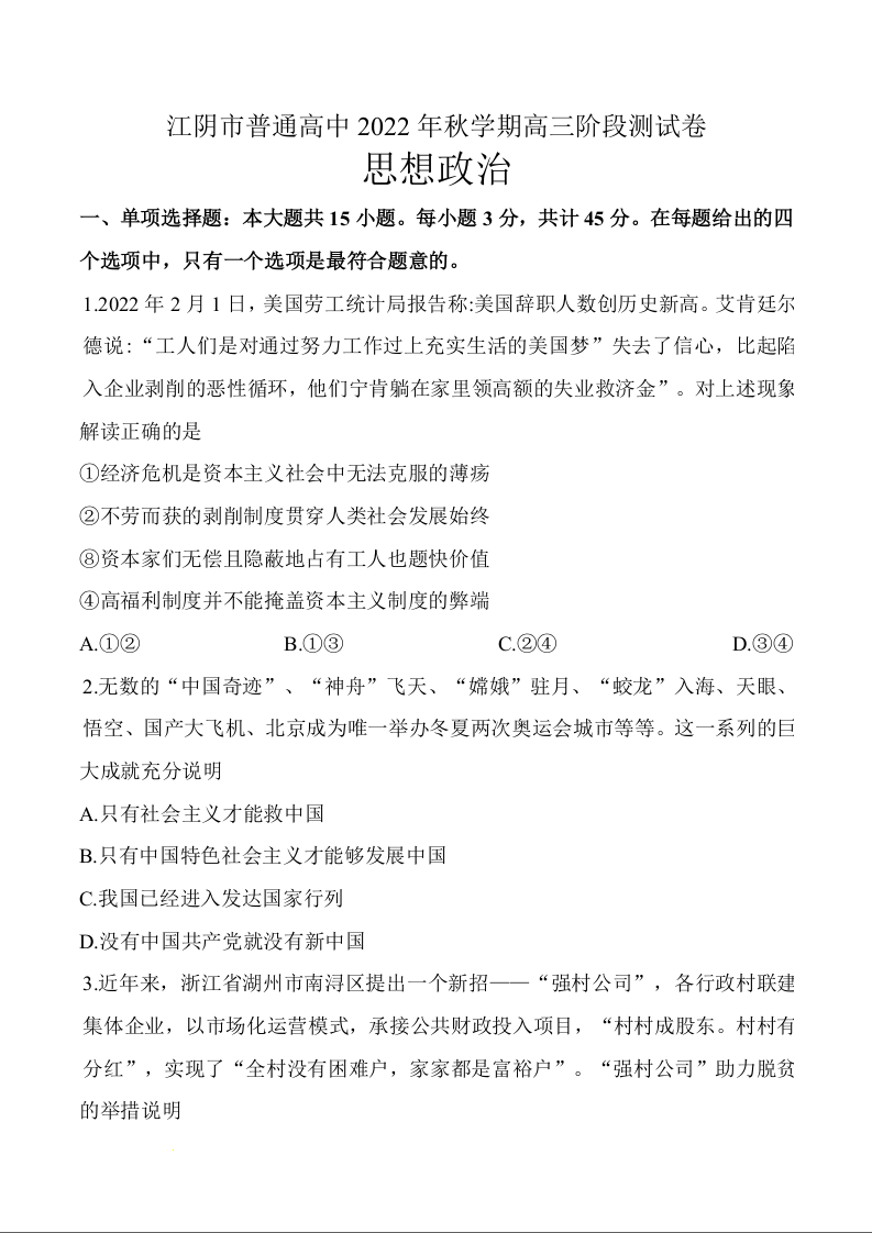 高三政治--江苏省无锡市江阴市普通高中2022-2023学年高三上学期阶段测试(期末)
