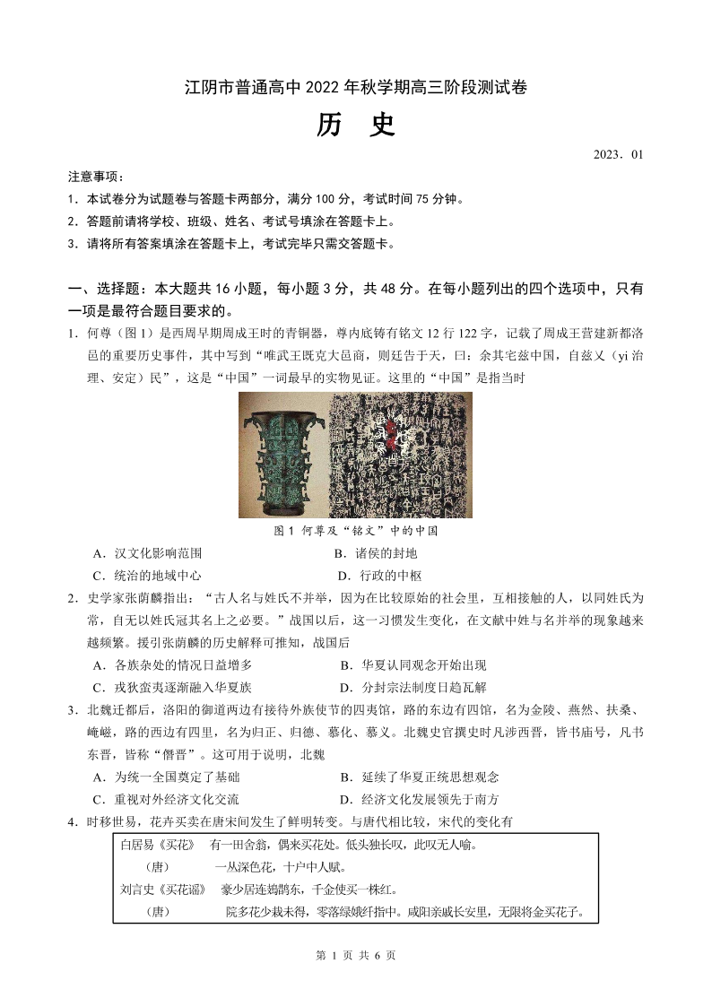 高三历史--江苏省无锡市江阴市普通高中2022-2023学年高三上学期阶段测试(期末)