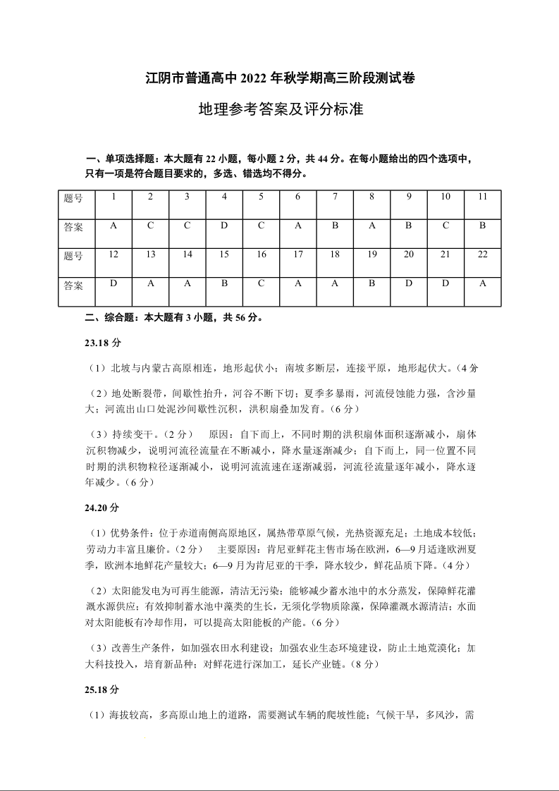高三地理答案--江苏省无锡市江阴市普通高中2022-2023学年高三上学期阶段测试(期末)