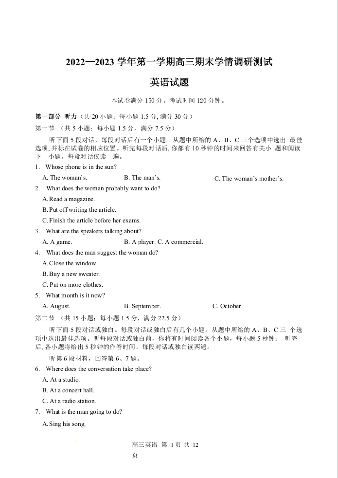 高三英语--江苏省扬州市高邮市高邮市2022-2023学年高三上学期1月期末