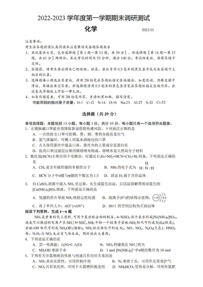 高三化学+答案--江苏省扬州市高邮市高邮市2022-2023学年高三上学期1月期末
