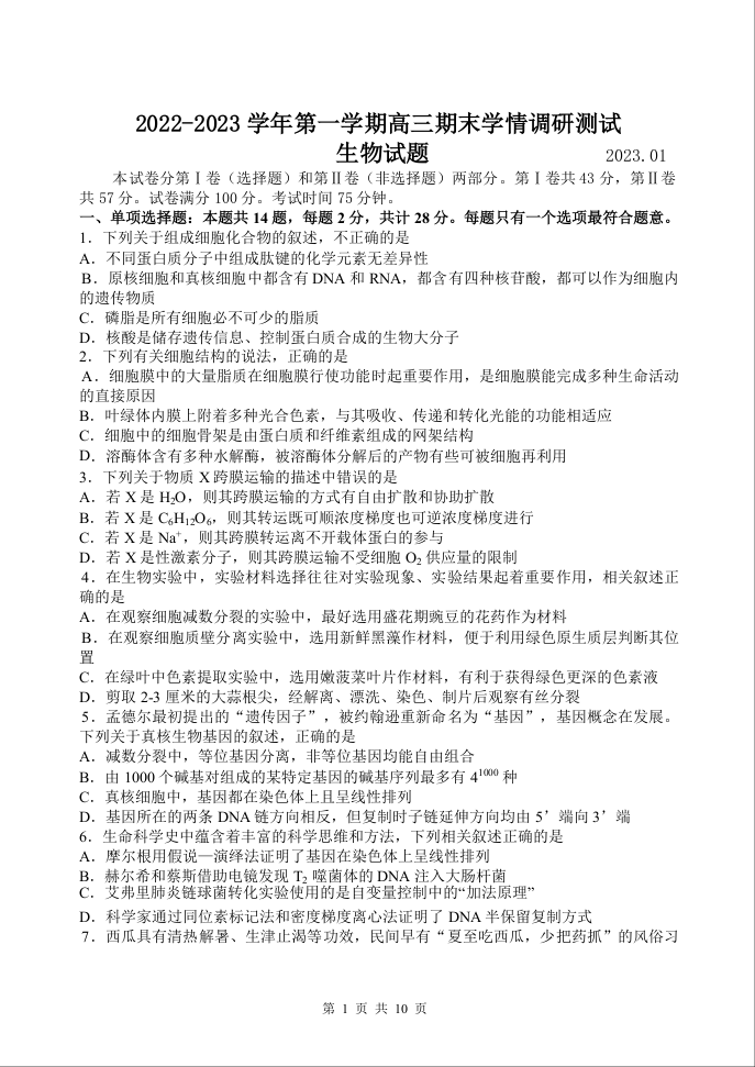 高三生物+答案--江苏省扬州市高邮市高邮市2022-2023学年高三上学期1月期末