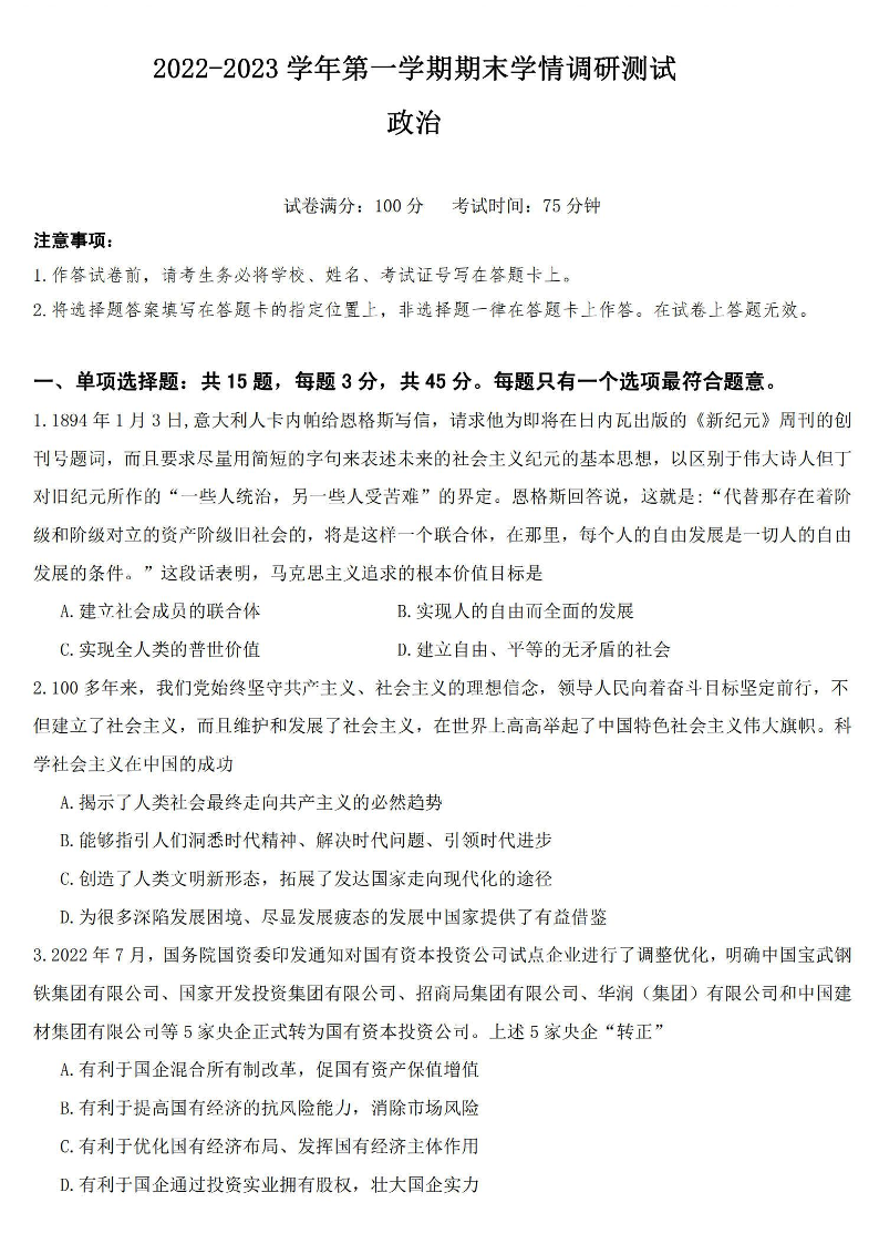 高三政治+答案--江苏省扬州市高邮市高邮市2022-2023学年高三上学期1月期末