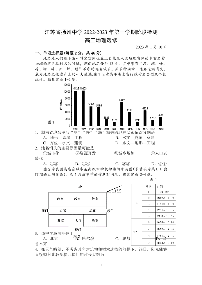 高三地理+答案--江苏省扬州中学高三上学期1月月考(期末)