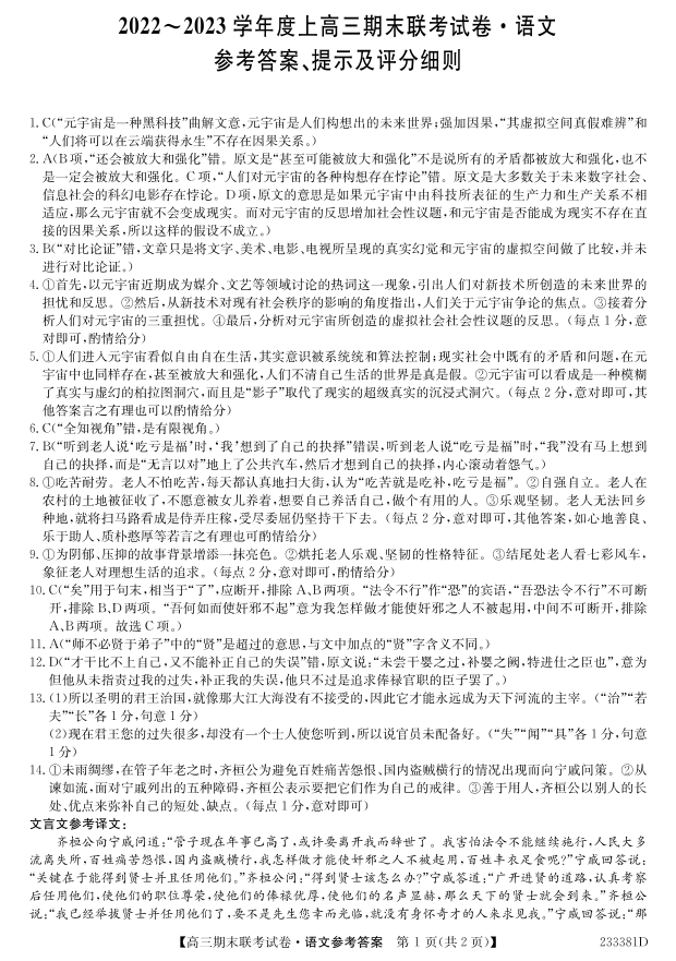 高三语文答案--辽宁省2022-2023学年高三上学期期末联考