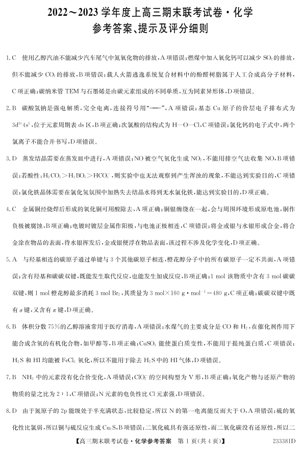 高三化学答案--辽宁省2022-2023学年高三上学期期末联考