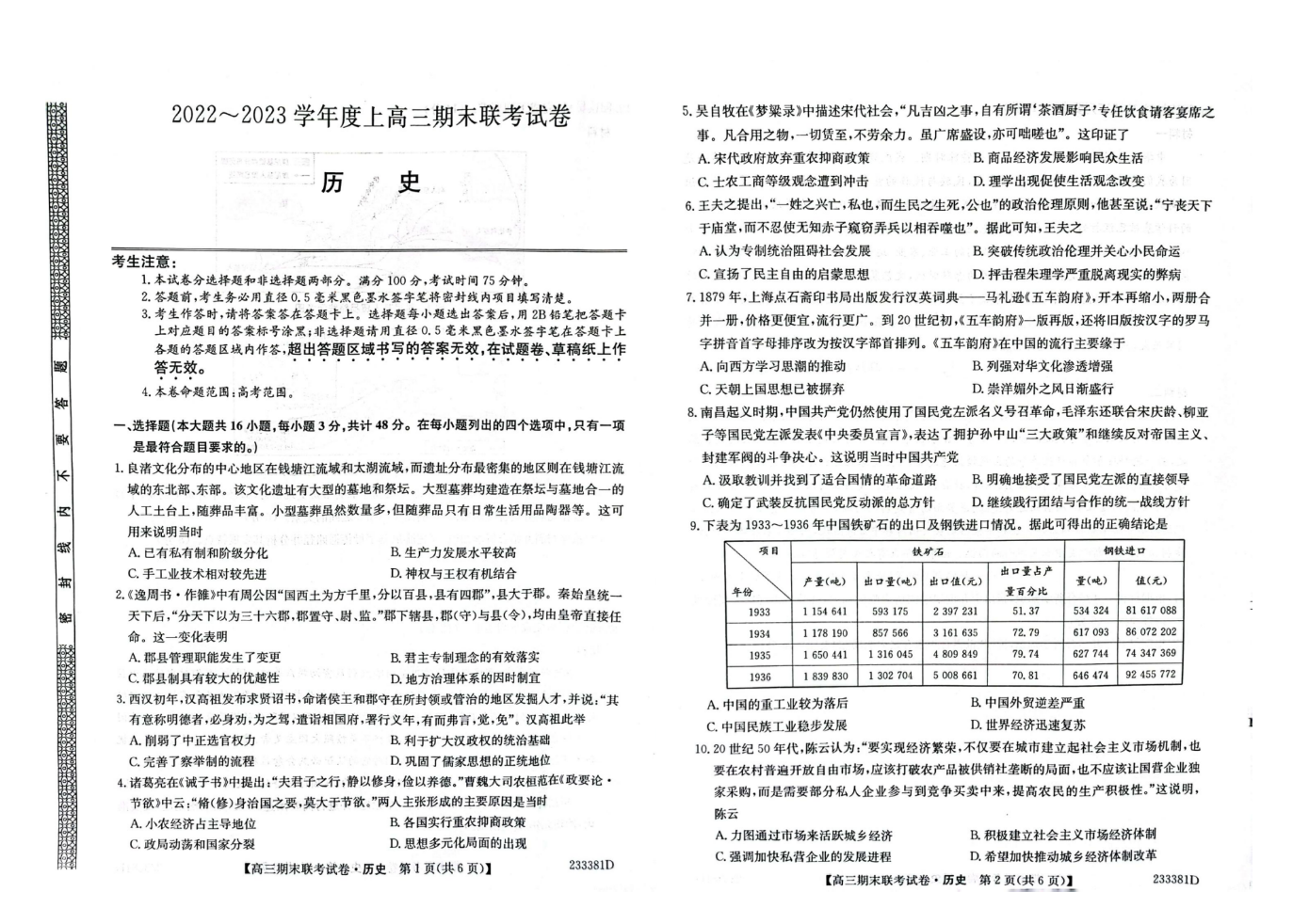 高三历史--辽宁省2022-2023学年高三上学期期末联考