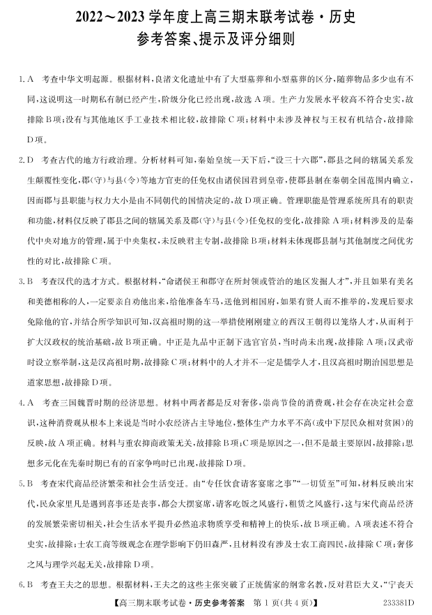 高三历史答案--辽宁省2022-2023学年高三上学期期末联考