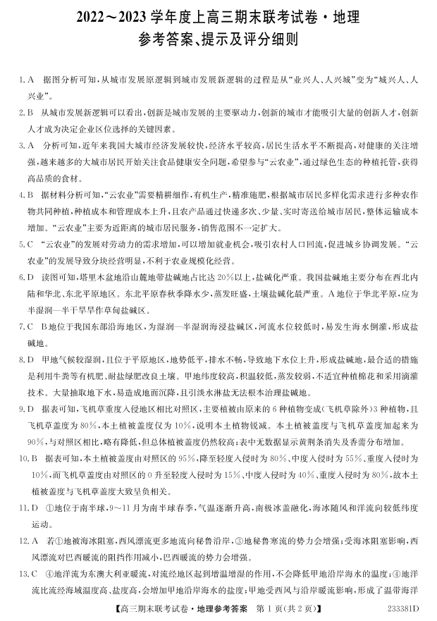 高三地理答案--辽宁省2022-2023学年高三上学期期末联考