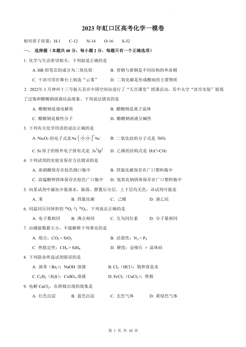 高三化学+答案--上海市虹口区2023届高三上学期期末质量监控测试(一模)