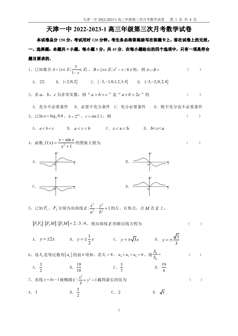 高三数学--天津市第一中学2022-2023学年高三上学期第三次月考