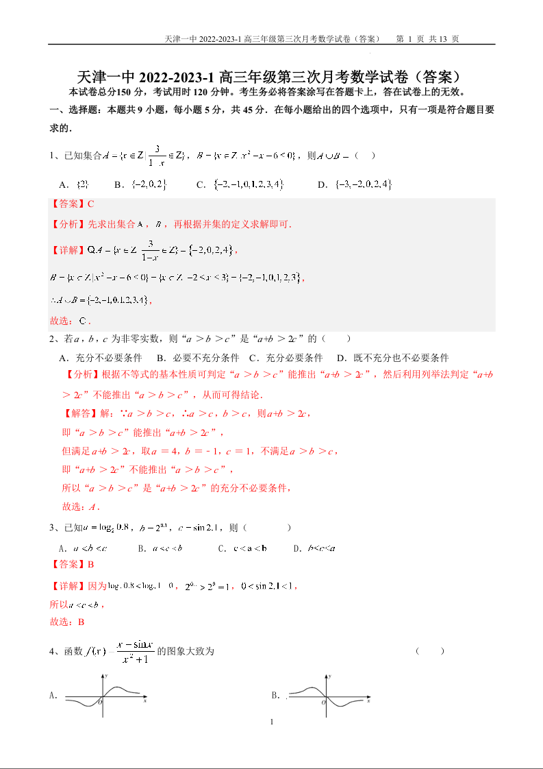 高三数学答案--天津市第一中学2022-2023学年高三上学期第三次月考