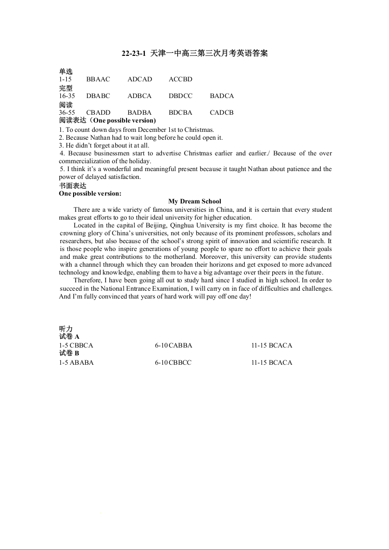 高三英语答案--天津市第一中学2022-2023学年高三上学期第三次月考