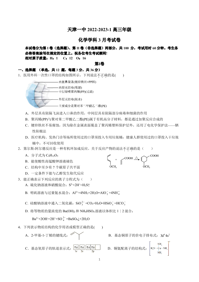 高三化学--天津市第一中学2022-2023学年高三上学期第三次月考