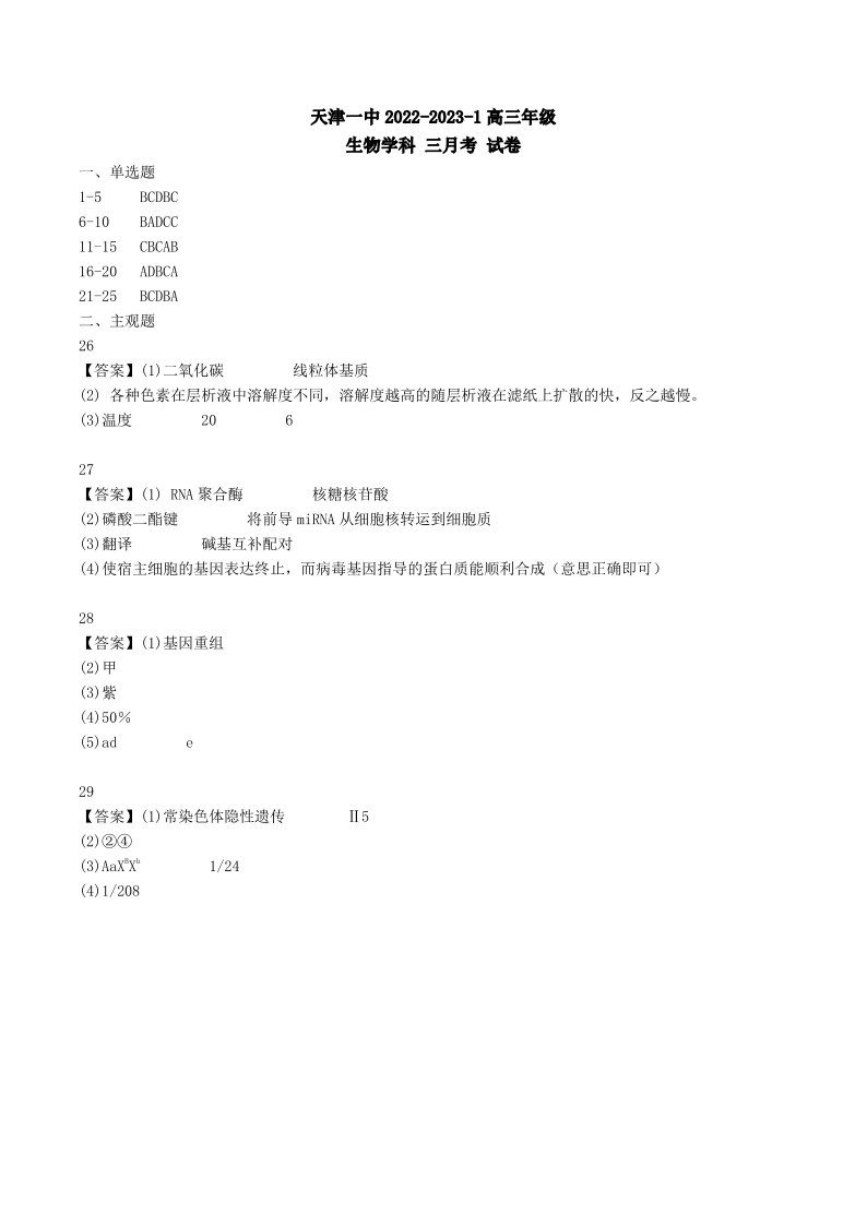 高三生物答案--天津市第一中学2022-2023学年高三上学期第三次月考